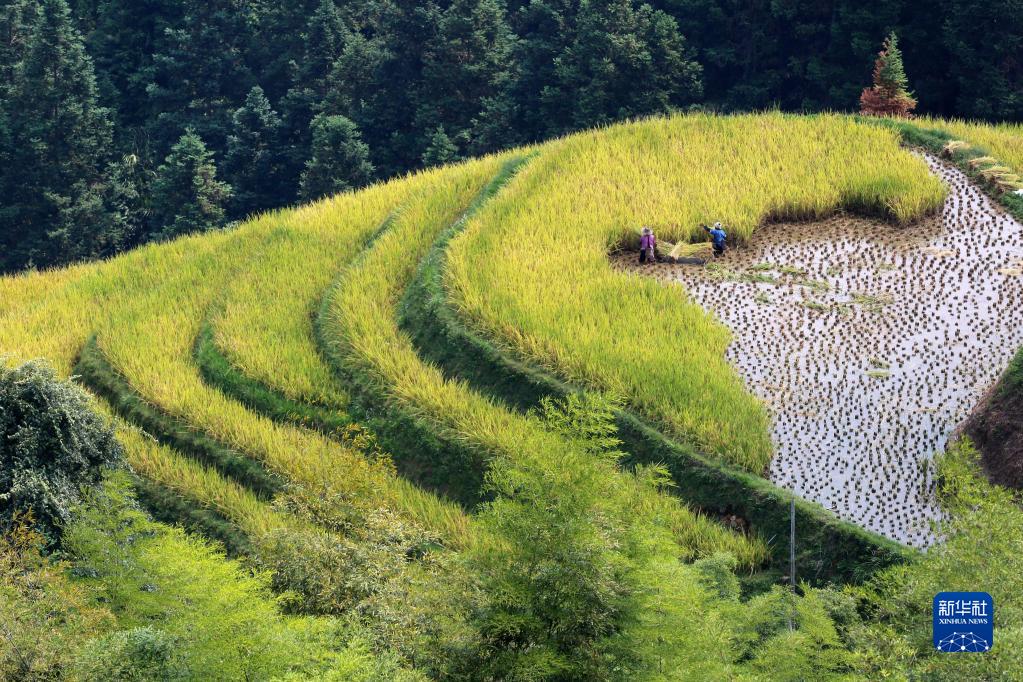 9月22日,農民在貴州省榕江縣計劃鄉加宜村梯田收割稻谷。