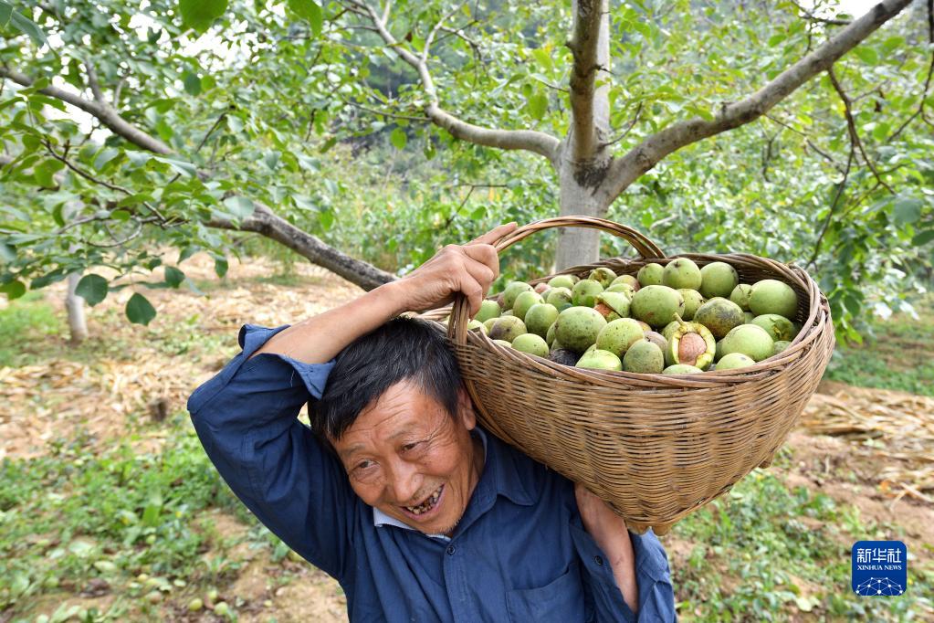 9月15日,在湖北省襄陽(yáng)市??悼h店埡鎮大林村核桃種植基地,村民搬運采收的鮮核桃。
