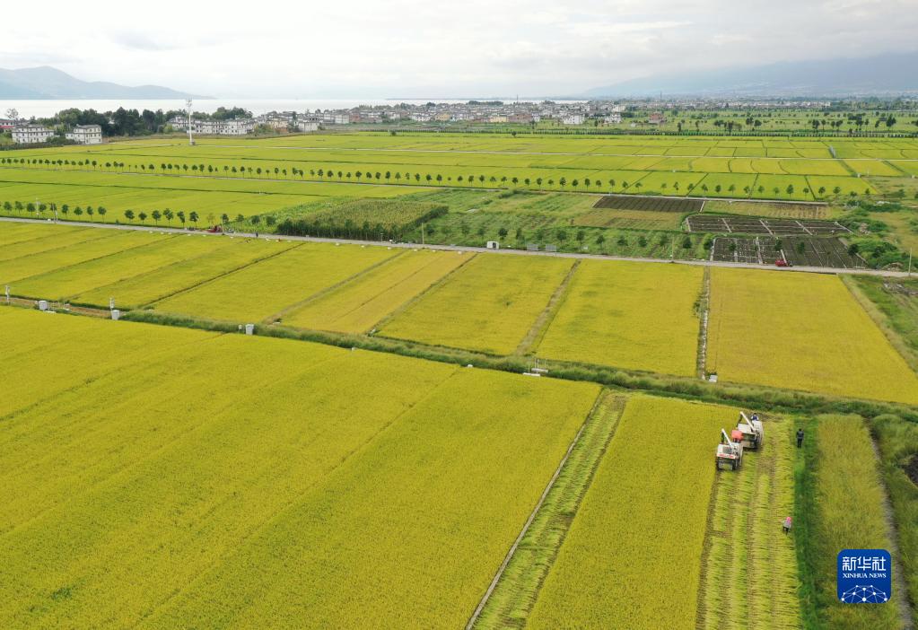 9月22日,在云南省大理市灣橋鎮古生村,村民在洱海邊的種植基地收割水稻(無(wú)人機照片)。