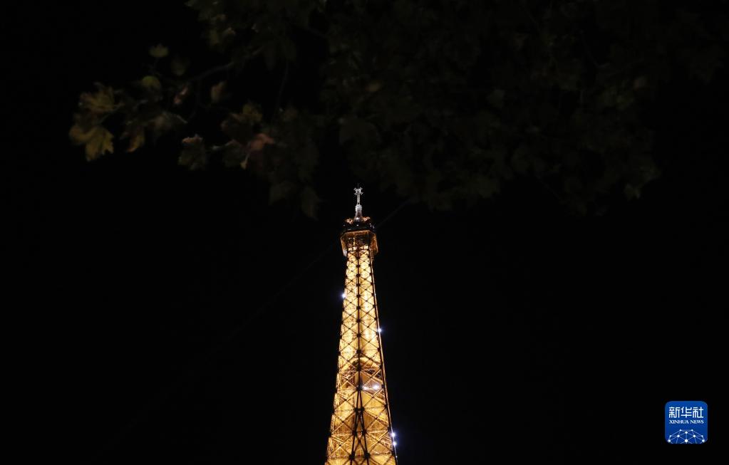 這是9月22日拍攝的整點(diǎn)時(shí)刻閃燈的法國巴黎地標性建筑——埃菲爾鐵塔。