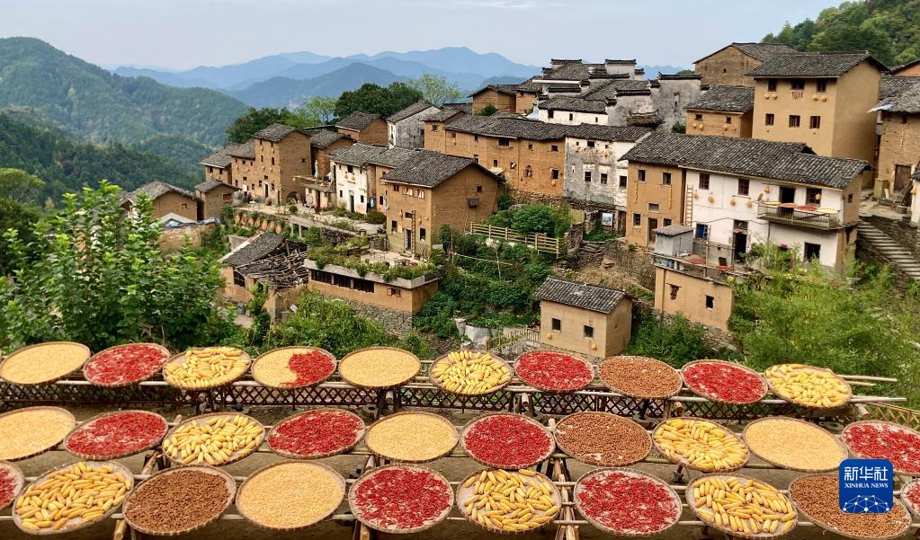 9月23日在安徽省黃山市歙縣陽(yáng)產(chǎn)土樓拍攝的曬秋圖景。