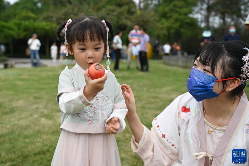 9月23日,小朋友在西溪濕地準備品嘗成熟的火柿。