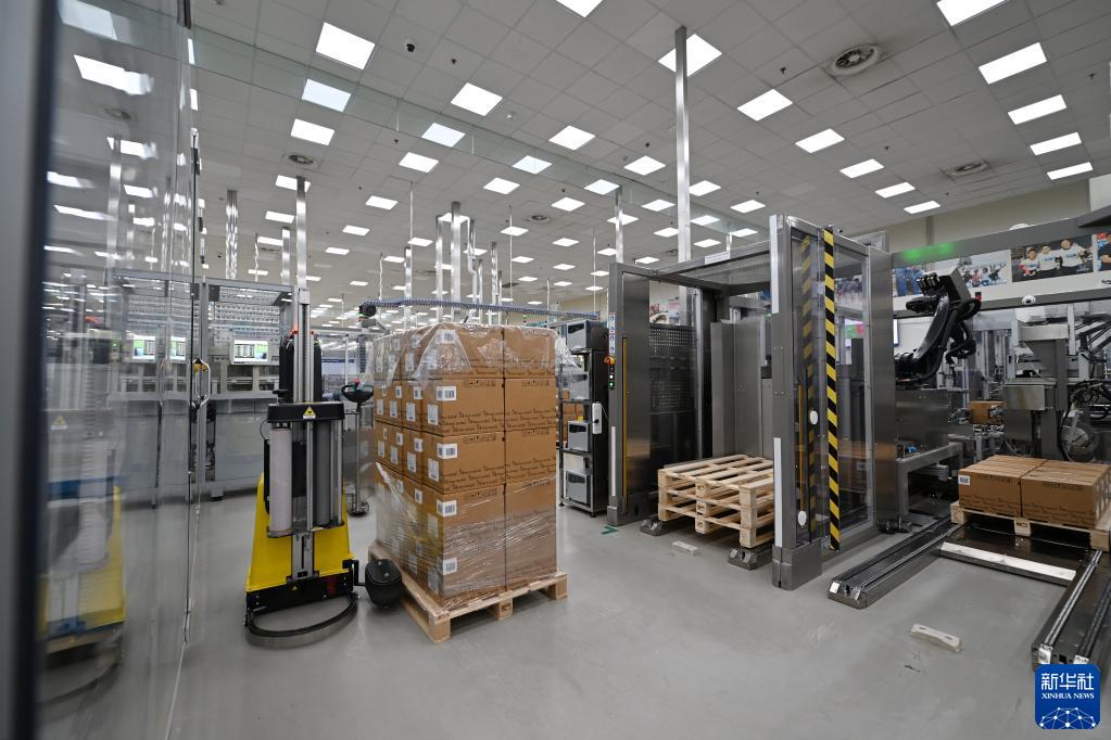 在諾和諾德(中國)制藥有限公司天津生產(chǎn)廠(chǎng)內,纏膜機器人進(jìn)行包裝作業(yè)(9月22日攝)。