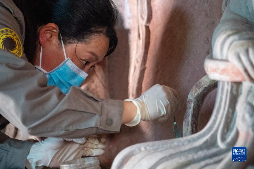 9月22日,大足石刻研究院保護工程中心的工作人員對舒成巖摩崖造像進(jìn)行本體修復。