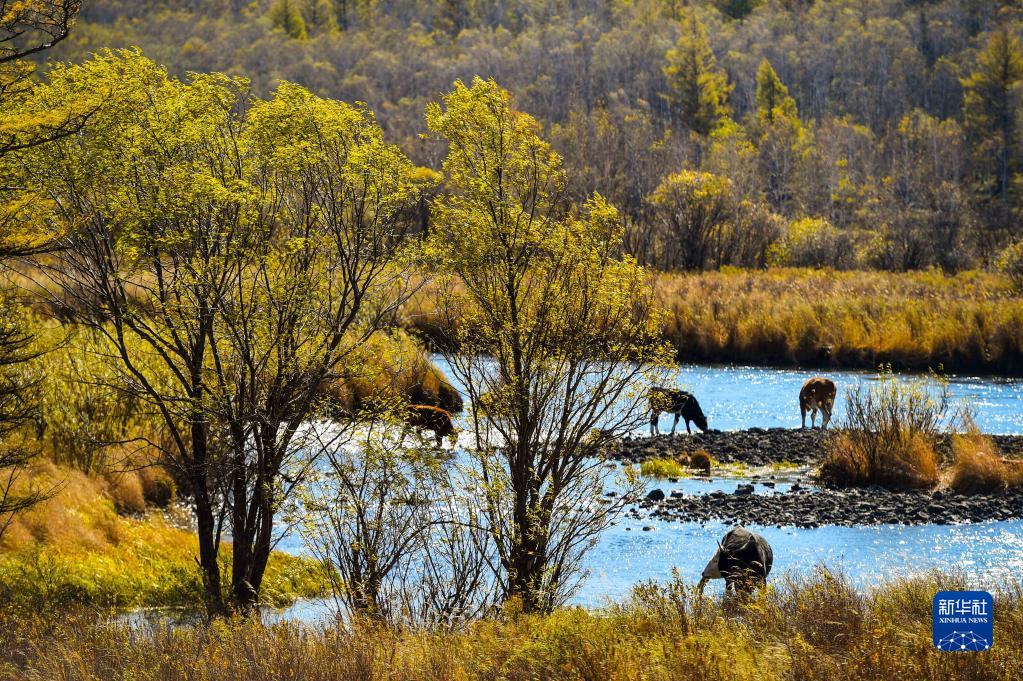 9月21日,牛群在阿爾山國家森林公園內的河岸邊覓食。
