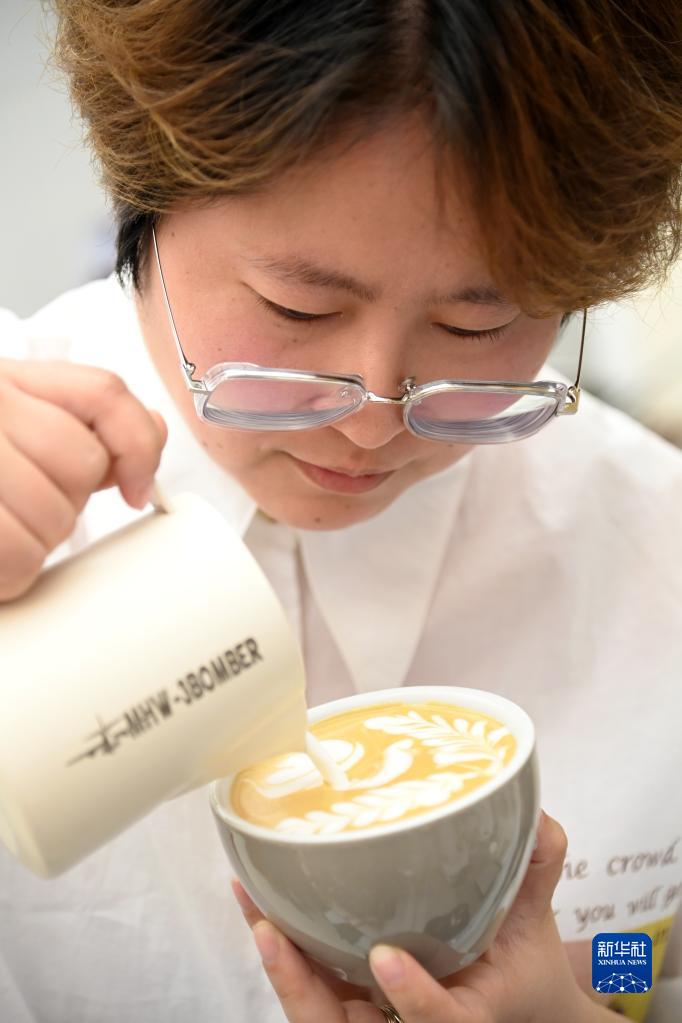 9月24日,聽(tīng)障咖啡師陳佳悅在自己經(jīng)營(yíng)的咖啡館里為顧客制作咖啡。