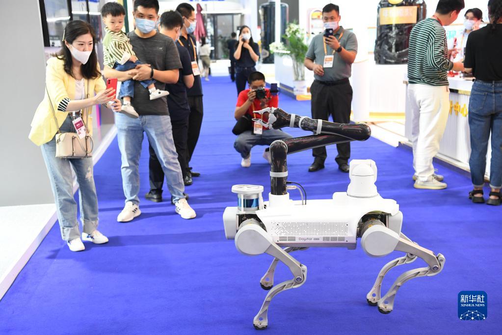 參觀(guān)者在安徽合肥舉辦的2022世界制造業(yè)大會(huì )上拍攝展出的一款四足巡檢機器人(9月20日攝)。