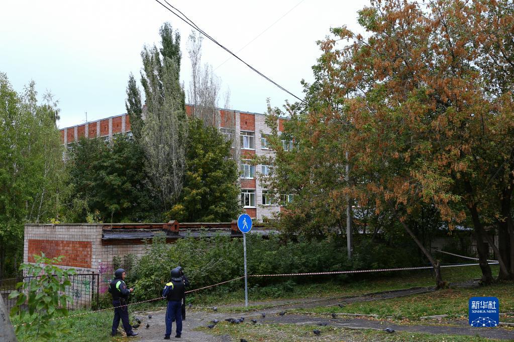 9月26日,在俄羅斯伊熱夫斯克,安全人員在案發(fā)現場(chǎng)附近警戒。