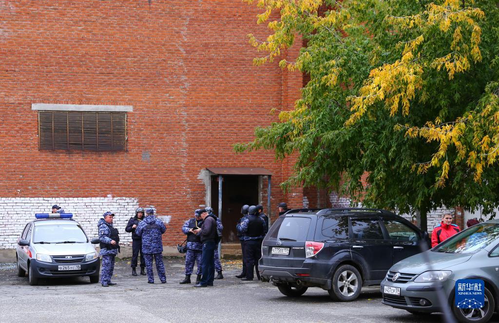 9月26日,在俄羅斯伊熱夫斯克,安全人員在案發(fā)現場(chǎng)附近警戒。