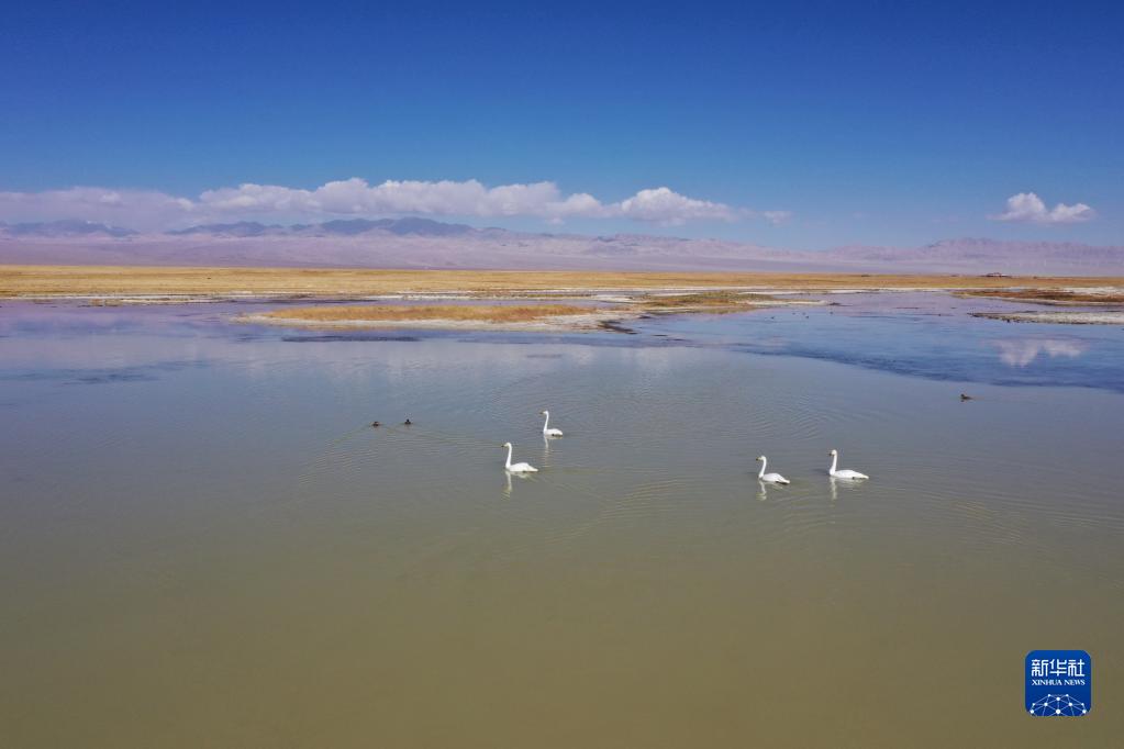 9月27日,天鵝和水鳥(niǎo)在小蘇干湖上游動(dòng)覓食(無(wú)人機照片)。