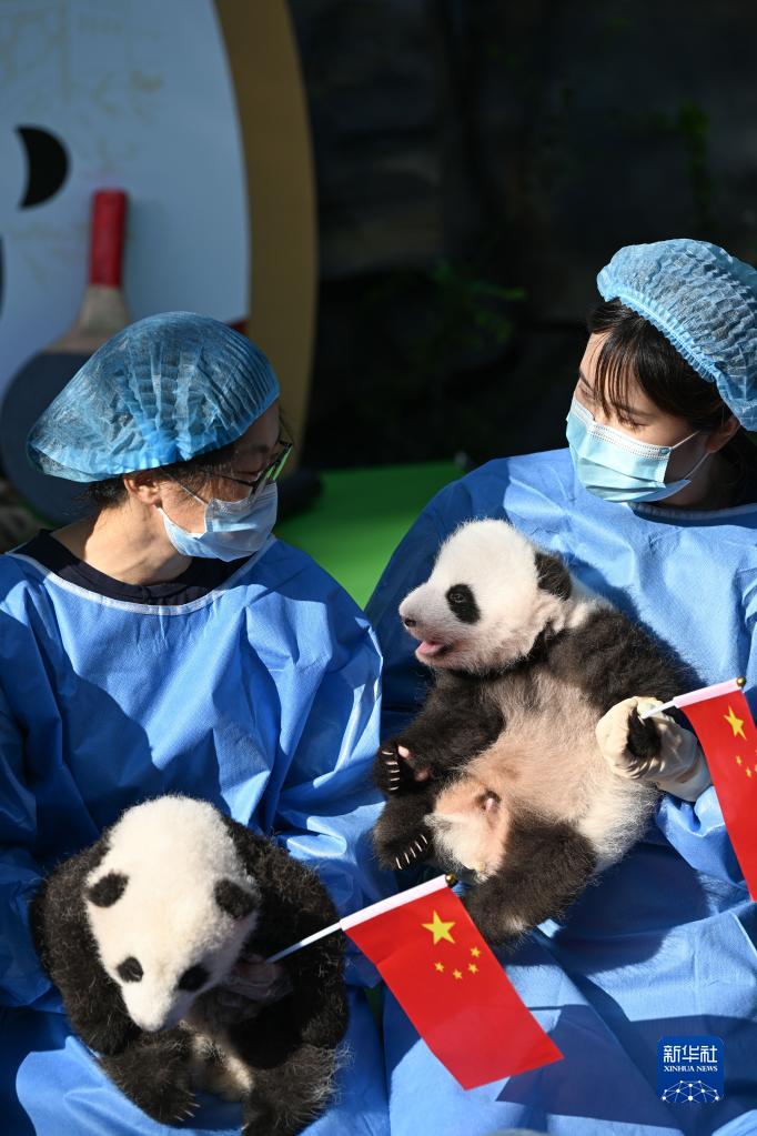 9月28日,成都大熊貓繁育研究基地工作人員抱著(zhù)2022級新生大熊貓幼仔亮相太陽(yáng)產(chǎn)房。