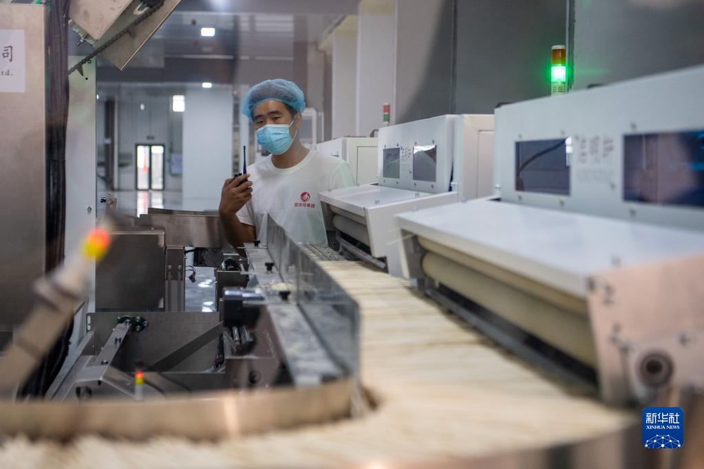 9月29日,在位于重慶忠縣新生港的重慶金沙河面業(yè)生產(chǎn)車(chē)間,工作人員在生產(chǎn)線(xiàn)上忙碌。