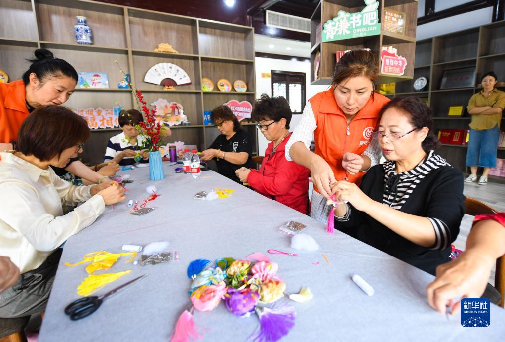 9月29日,在愛(ài)山街道衣裳街社區,“幸福鄰里”志愿者和老年居民共同制作茱萸香囊。