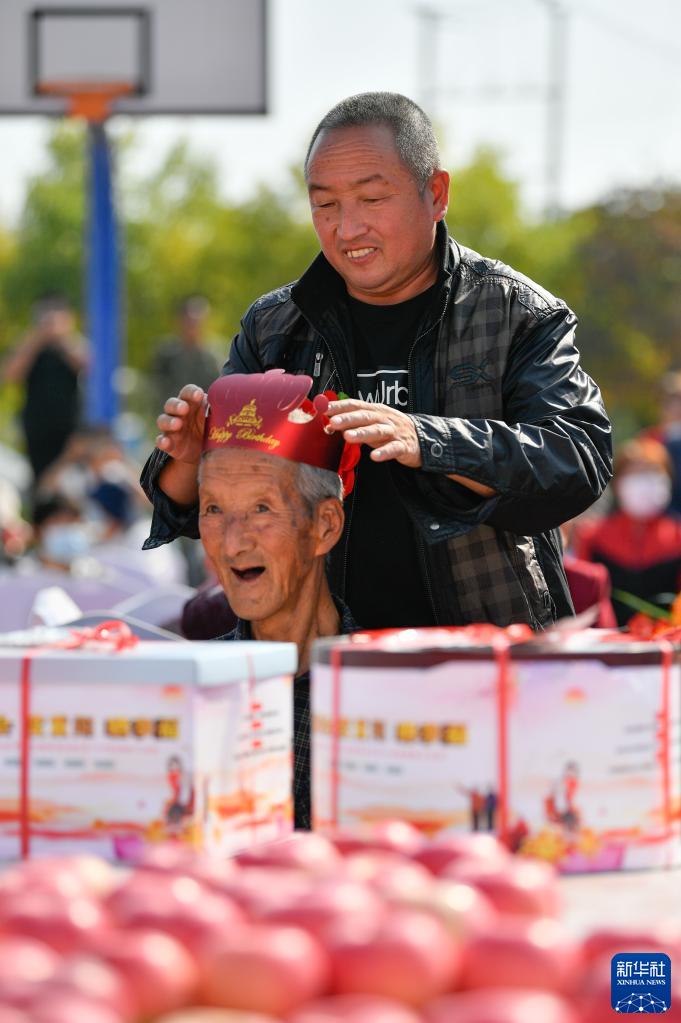 9月28日,在天津市薊州區羅莊子鎮楊家峪村,晚輩為長(cháng)輩戴上生日帽。
