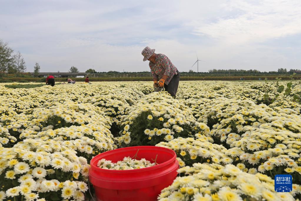 9月29日,在安徽省濉溪縣四鋪鎮菊花種植基地,村民在采收藥用菊花。