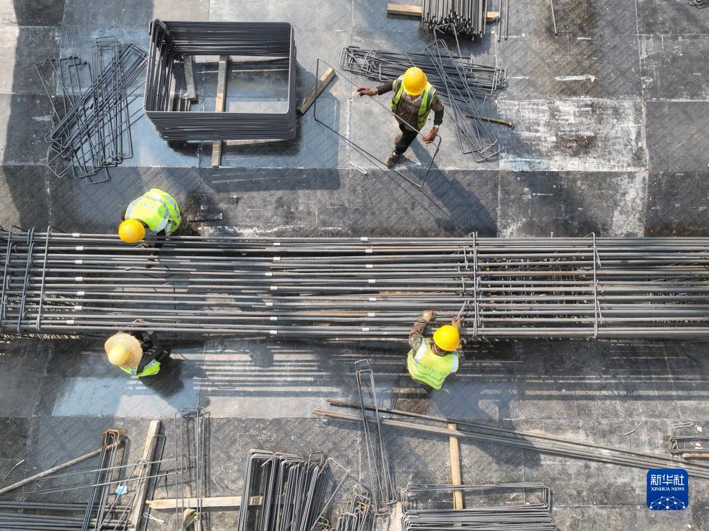 10月1日,工人在位于安徽省合肥市的中鐵上海工程局合肥軌道交通8號線(xiàn)項目工地作業(yè)(無(wú)人機照片)。