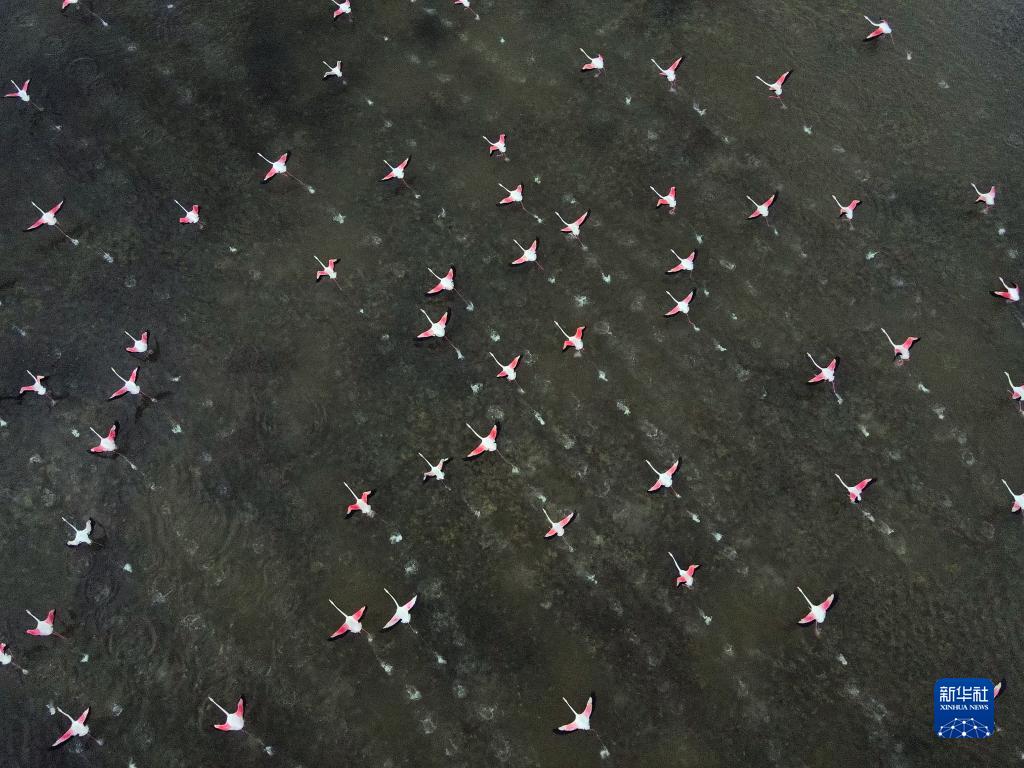 這是9月28日在土耳其首都安卡拉航拍的在湖面上飛翔的火烈鳥(niǎo)。
