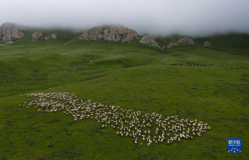 在四川省若爾蓋縣麥溪鄉黑河牧場(chǎng)上,牛羊成群(2022年7月25日攝,無(wú)人機照片)。