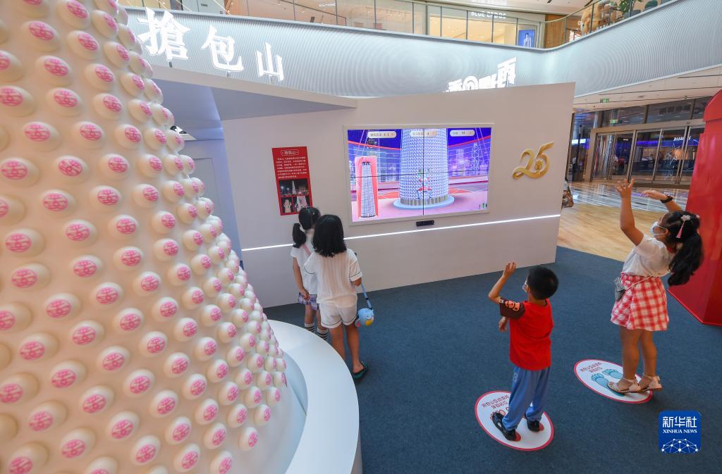 10月1日,兒童在“再遇@香港”展覽上體驗香港長(cháng)洲“搶包山”比賽互動(dòng)游戲。
