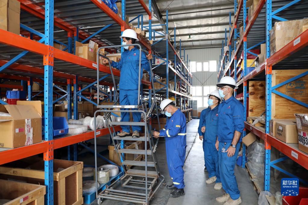 9月24日,在伊拉克米桑省,中伊雙方工作人員在哈法亞油田一處庫房里清點(diǎn)設備。新華社發(fā)(哈利勒·達伍德攝)