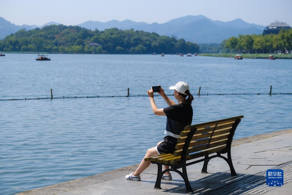 10月2日,一名游客在西湖邊拍照留影。