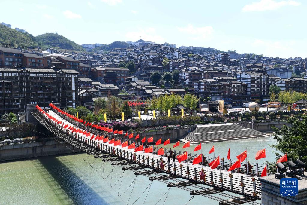 10月3日,在貴州省仁懷市茅臺鎮,茅臺渡口鐵索橋上的五星紅旗迎風(fēng)飄揚。