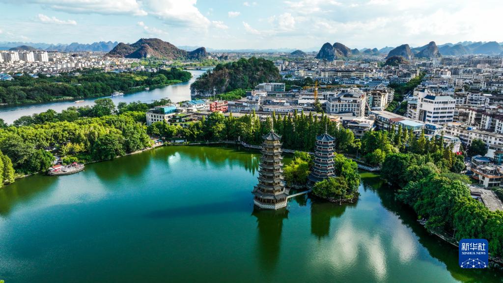 這是10月3日拍攝的廣西桂林市日月雙塔風(fēng)光(無(wú)人機照片)。
