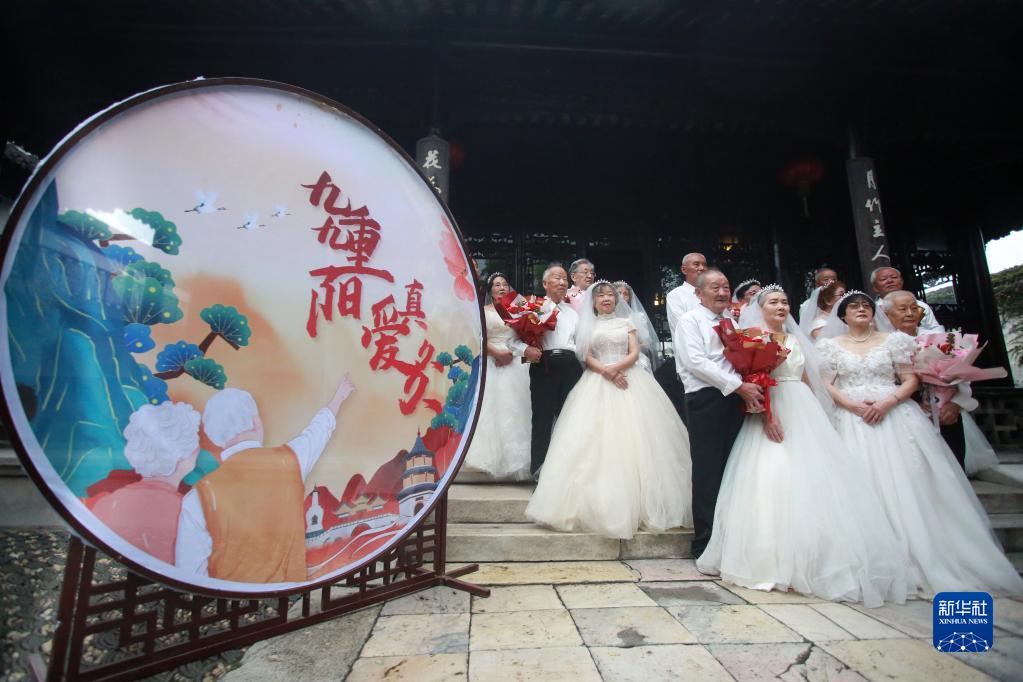 10月4日,在江蘇省揚州市何園景區,參加金婚慶典的老人拍照留念。