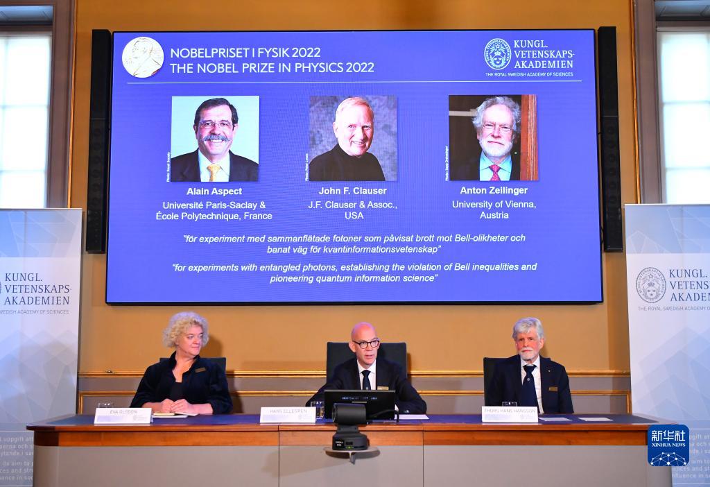10月4日,在瑞典斯德哥爾摩舉行的2022年諾貝爾物理學(xué)獎公布現場(chǎng),屏幕上顯示獎項得主阿蘭·阿斯佩(左)、約翰·克勞澤(中)和安東·蔡林格的照片。