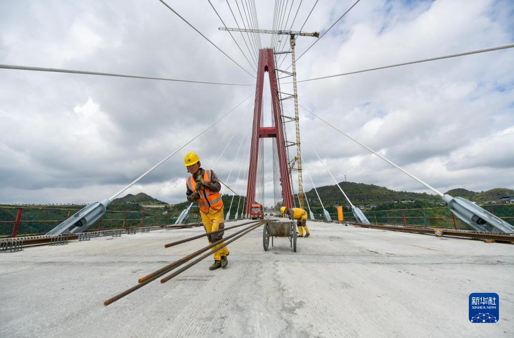 10月6日,中交二公局的工人在貴州龍里河大橋上搬運材料。