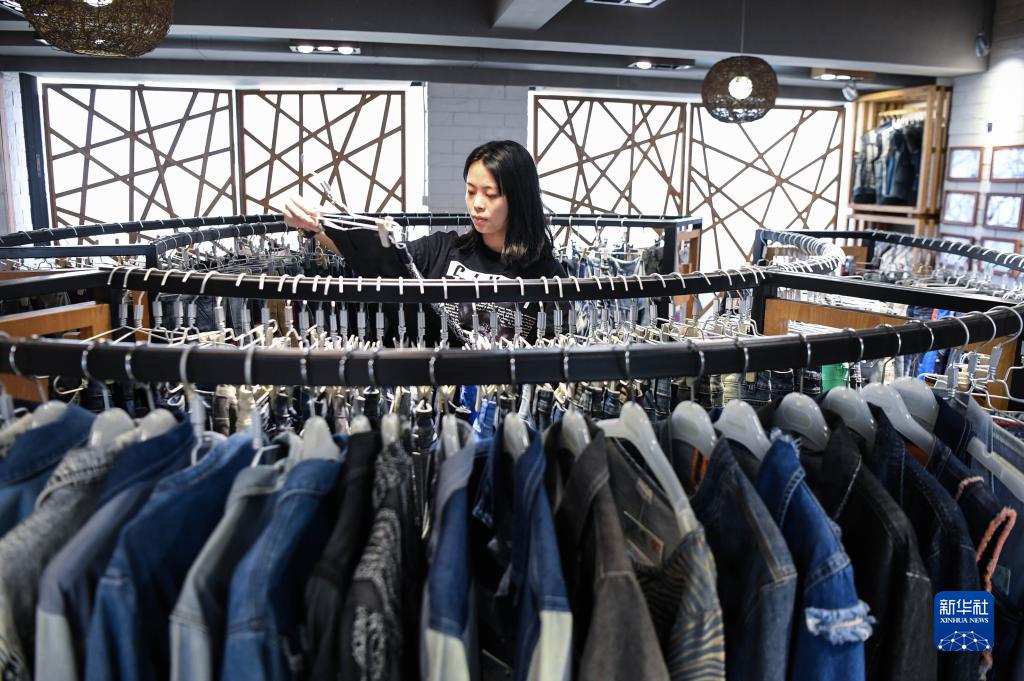 在廣東省紡織品進(jìn)出口股份有限公司,工作人員在整理廣交會(huì )線(xiàn)上展廳的服裝(10月14日攝)。