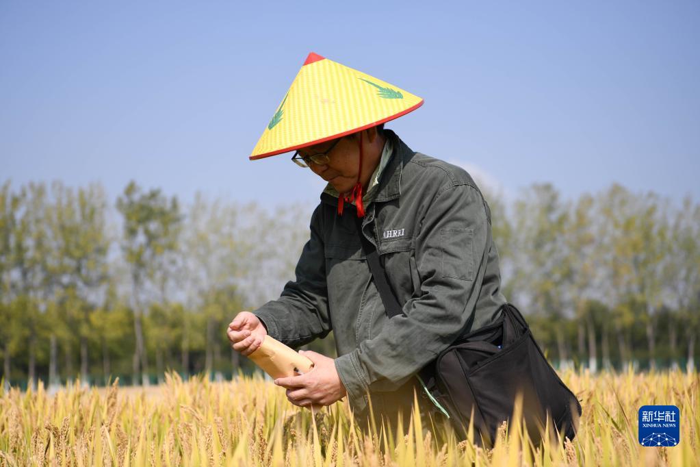 10月15日,在牛角大圩水稻試驗示范基地內,安徽省農業(yè)科學(xué)院水稻研究所工作人員夏加發(fā)在進(jìn)行稻種收集。