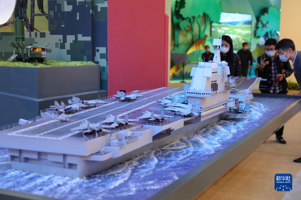 觀(guān)眾在“奮進(jìn)新時(shí)代”主題成就展第八單元“堅持走中國特色強軍之路 全面推進(jìn)國防和軍隊現代化”展廳觀(guān)看山東艦模型(10月12日攝)。新華社記者 許雅楠 攝