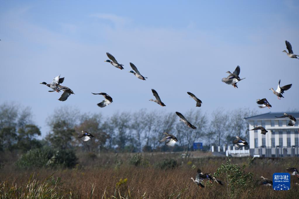 10月20日,鳥(niǎo)兒在十八聯(lián)圩濕地上空飛舞。