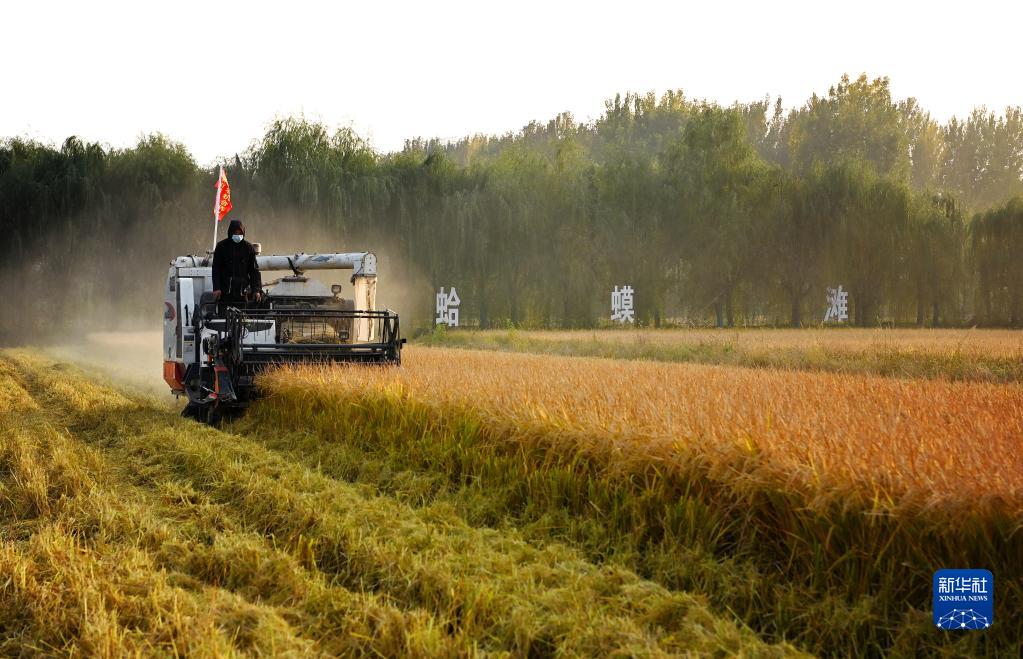 在西安市長(cháng)安區王曲街道皇甫村,村民駕駛收割機收割水稻(10月21日攝)。