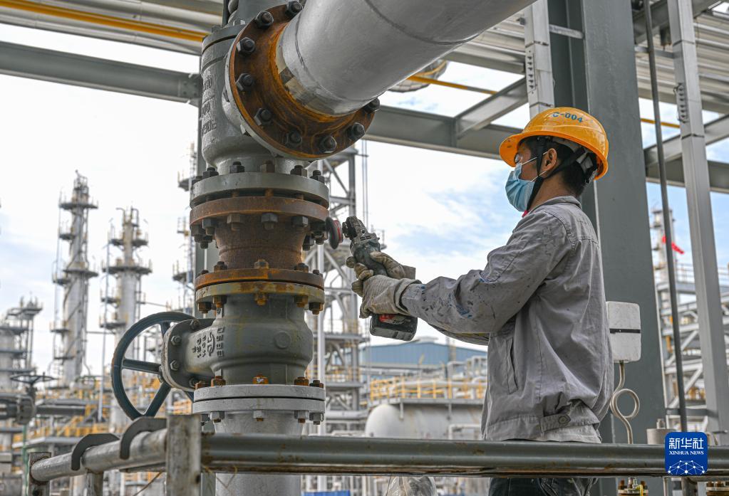 10月22日,工人在海南東方臨港產(chǎn)業(yè)園海南精細化工二期工程丙烯腈系列裝置項目工地施工。