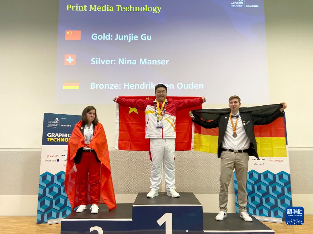 10月16日,在瑞士阿勞舉行的2022年世界技能大賽特別賽印刷媒體技術(shù)、平面設計技術(shù)兩個(gè)項目閉幕式上,獲得印刷媒體技術(shù)項目金牌的中國選手顧俊杰(中)在頒獎儀式上(手機拍攝)。