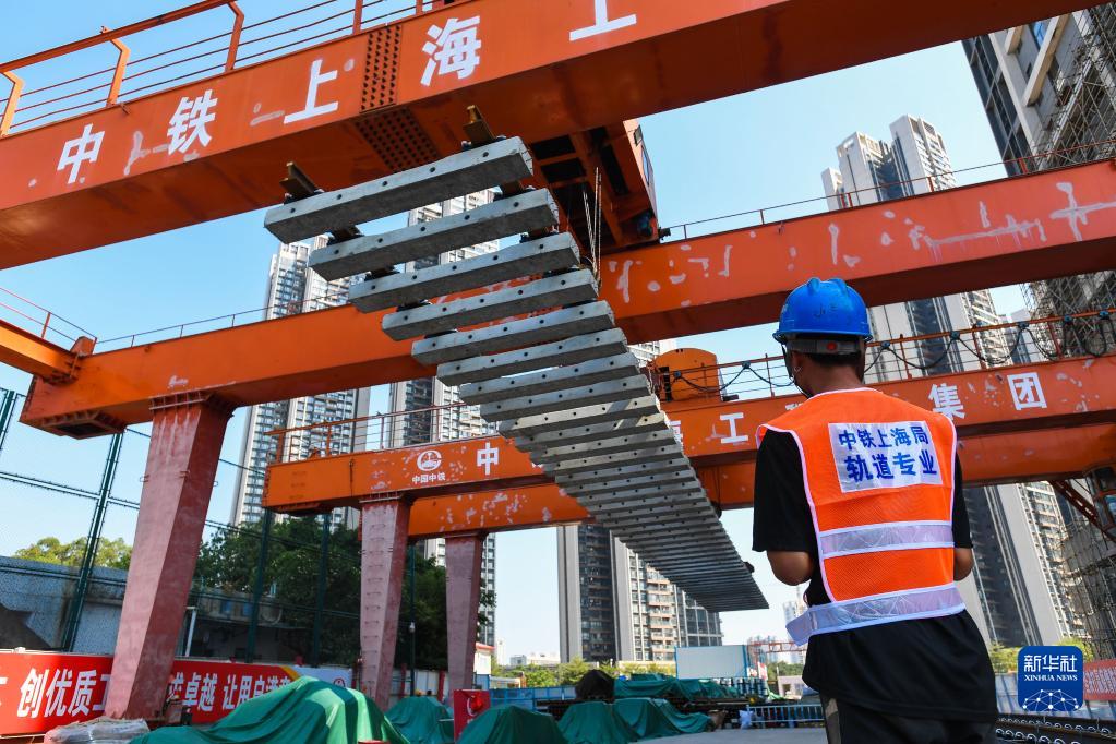 10月26日,施工人員在廣州地鐵11號線(xiàn)南石路站工區吊裝軌排。