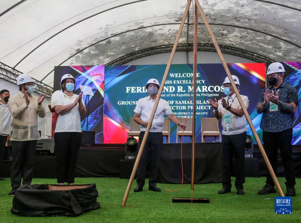 10月27日,菲律賓總統馬科斯(中)與菲律賓副總統莎拉·杜特爾特(左二)、中國駐菲律賓大使黃溪連(左一)、菲律賓公共工程和公路部長(cháng)曼努埃爾·博諾安(右二)、達沃市長(cháng)塞巴斯蒂安·杜特爾特(右一)等在達沃-薩馬爾島大橋的開(kāi)工儀式上埋設時(shí)間膠囊。
