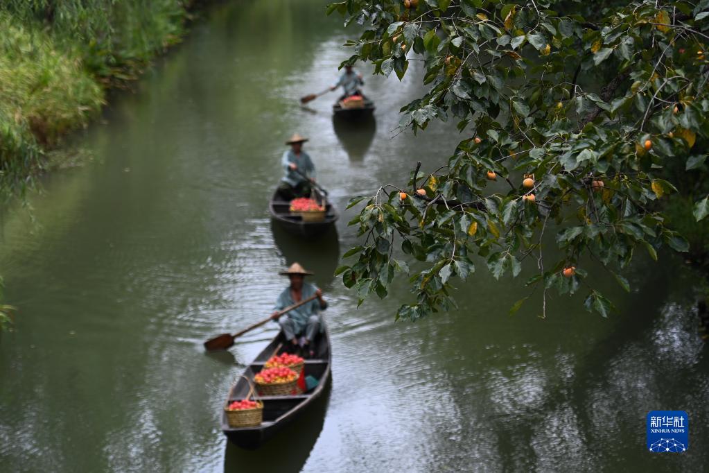 西溪濕地的工作人員用船運送剛采摘的柿子(2022年9月23日攝,無(wú)人機照片)。