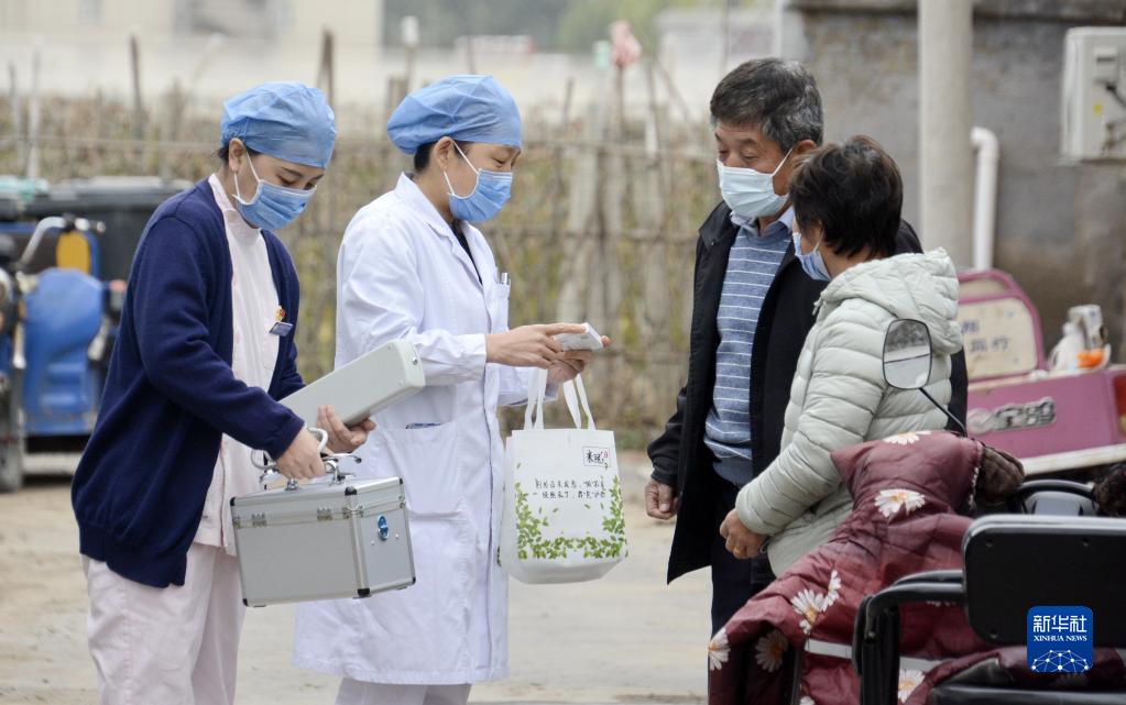 北京市大興區采育鎮社區衛生服務(wù)中心的農村醫務(wù)巡診團隊的醫護人員來(lái)到施家務(wù)村為村民上門(mén)送藥(10月27日攝)。