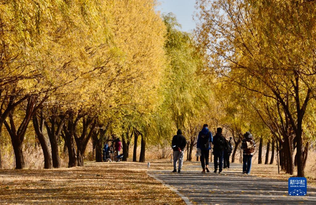 游人在北京野鴨湖國家濕地公園內賞秋(11月1日攝)。