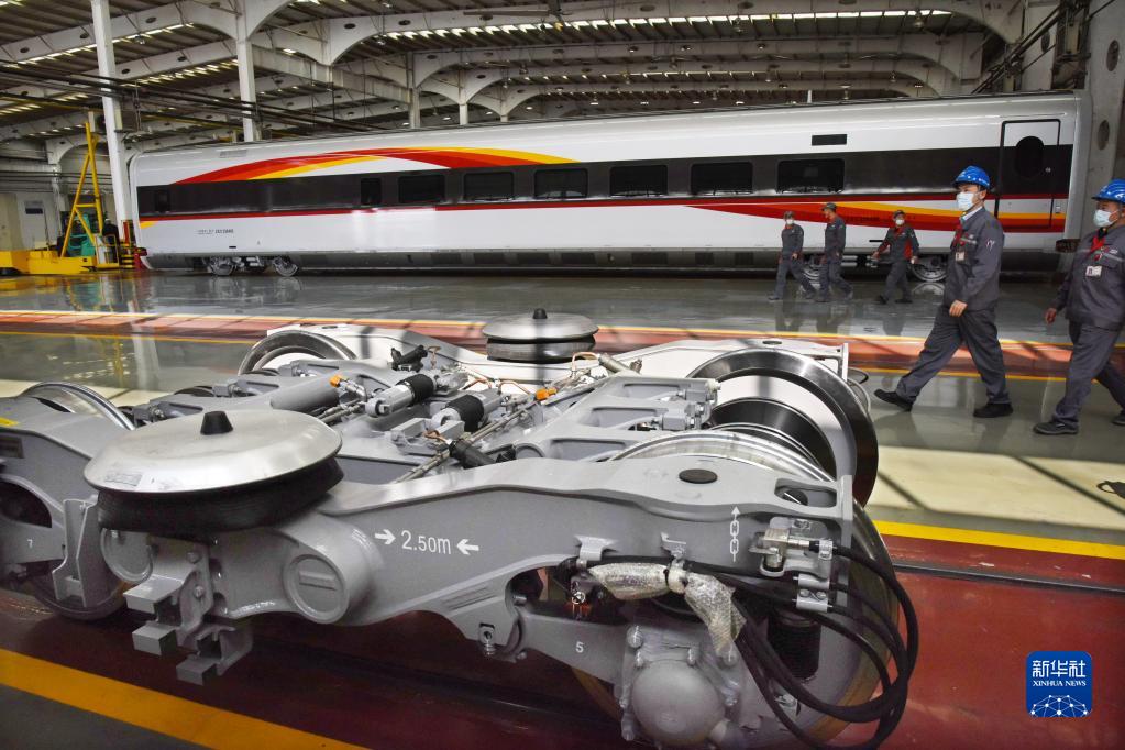 11月2日,郭銳(右二)來(lái)到中車(chē)青島四方機車(chē)車(chē)輛股份有限公司總裝車(chē)間,準備向工友們宣講黨的二十大精神。