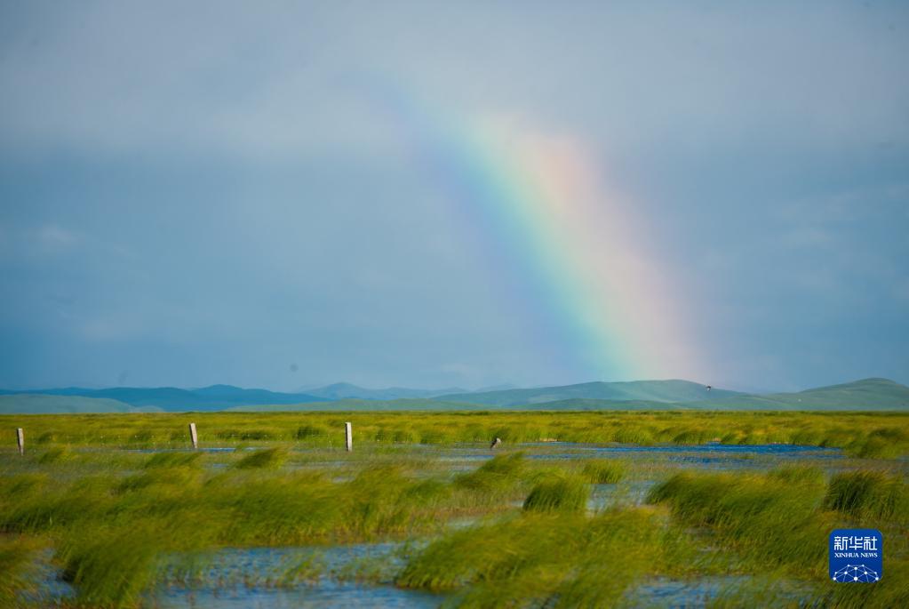 四川若爾蓋濕地國家級自然保護區若爾蓋花湖上空出現一道彩虹(2022年6月24日攝)。