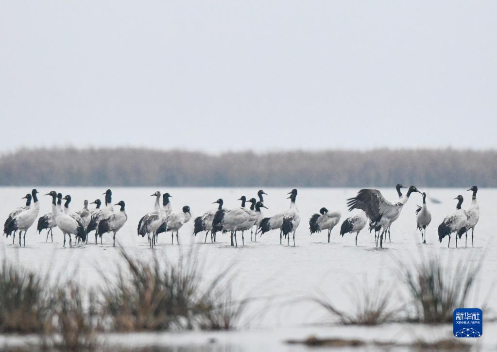 11月4日拍攝的在貴州草海棲息的國家一級保護動(dòng)物黑頸鶴。