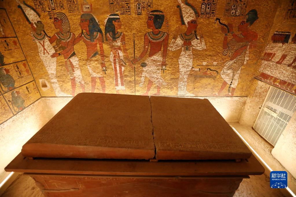 這是11月4日在位于埃及盧克索帝王谷的圖坦卡蒙墓內拍攝的壁畫(huà)和圖坦卡蒙的石棺。