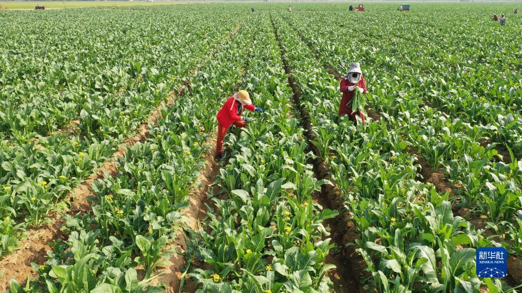 11月5日,在河南省許昌市建安區榆林鄉的蔬菜基地,菜農在采收蔬菜(無(wú)人機照片)。