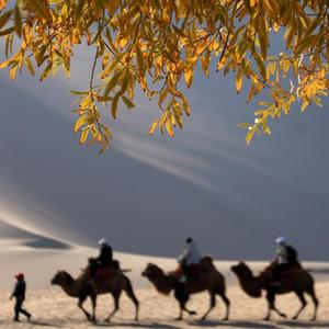 深秋時(shí)節,甘肅省敦煌市鳴沙山月牙泉景區被秋色渲染,風(fēng)景如畫(huà),引人入勝。