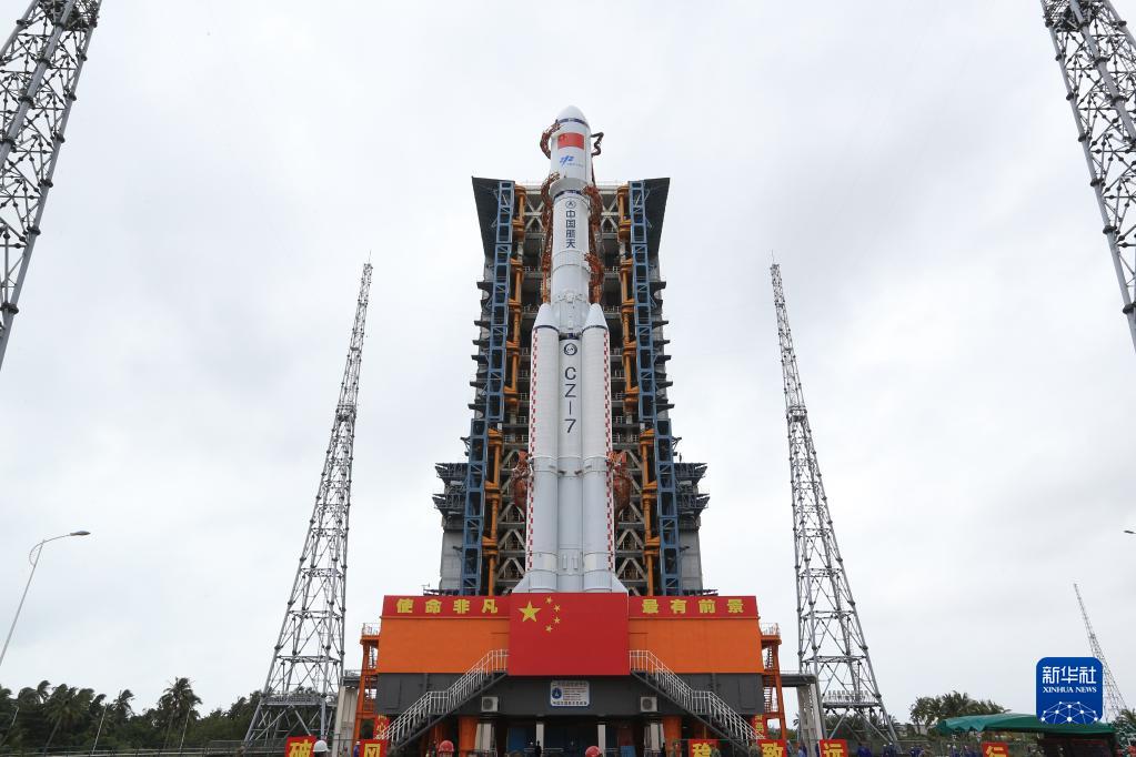 11月9日,天舟五號貨運飛船與長(cháng)征七號遙六運載火箭組合體轉運至發(fā)射塔架。