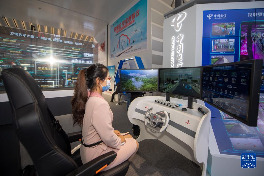 11月10日,中國電信展臺工作人員演示無(wú)人駕駛系統的運行。